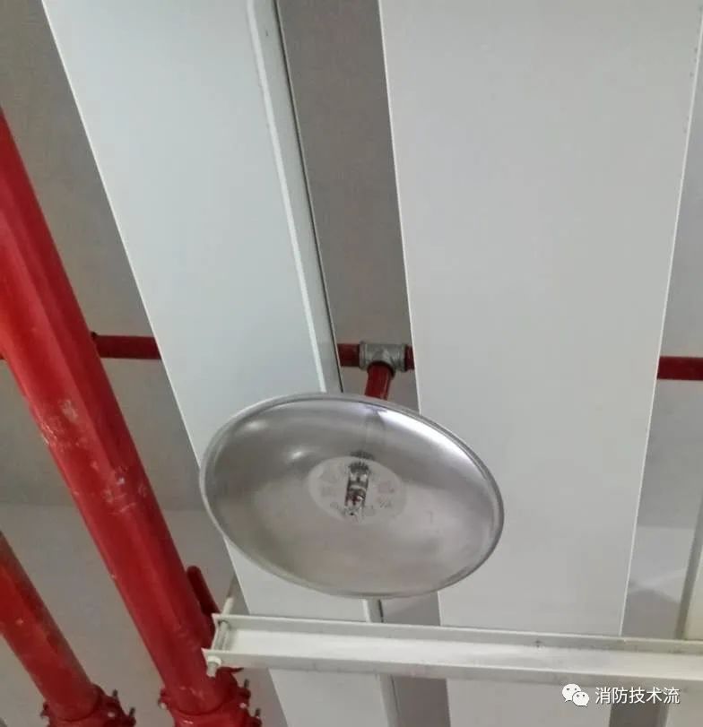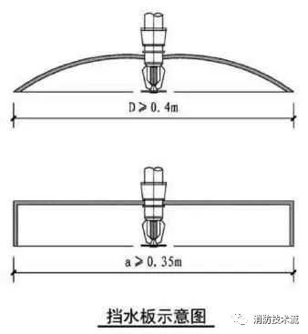 擋水板應(yīng)為正方形或圓形金屬板,其平面面積不宜小于0.12m2,周圍彎邊的下沿宜與灑水噴頭的濺水盤平齊。除下列情況和相關(guān)規(guī)范另有規(guī)定外,其他場所或部位不應(yīng)采用擋水板。