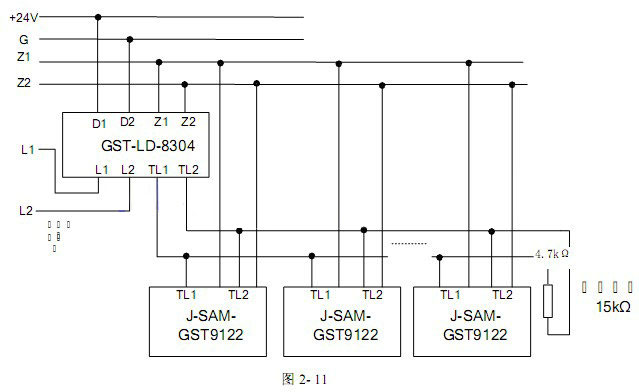 作為手動(dòng)火災(zāi)報(bào)警按鈕使用時(shí),將報(bào)警按鈕的Z1、Z2端子直接接入火災(zāi)報(bào)警控制器總線上即可。作為手動(dòng)火災(zāi)報(bào)警按鈕及消防電話插孔使用時(shí),將報(bào)警按鈕的Z1、Z2端子直接接入火災(zāi)報(bào)警控制器總線上,同時(shí)將報(bào)警按鈕的TL1、TL2端子與GST-LD-8304消防電話模塊連接,具體見圖2-11所示(最末端報(bào)警按鈕的TL1、TL2接線端子接4.7kΩ終端電阻)。